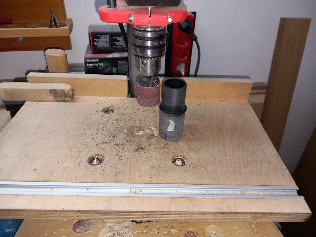 Από την άλλη, του άνοιξα μια τρύπα με forstner 30mm και έβαλα πρεσαριστό ένα ρουλεμάν που είχα, ώστε εκεί να χωθεί (επίσης πρεσαριστό) το αλουμινένιο προφίλ και έτσι, έφτιαξα την περιστρεφόμενη βάση