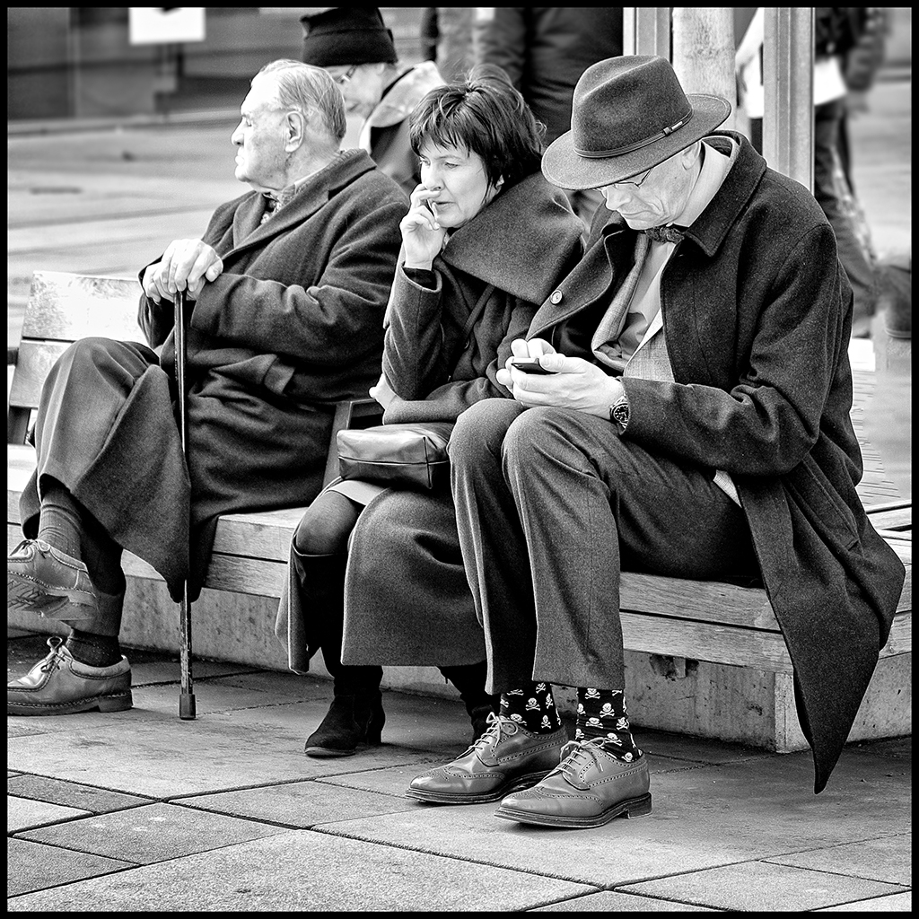 Ηλία θα διαφωνήσω με τους προλαλήσαντες ακόμα και αν υπάρχει δρωμενο (για να ακολουθήσω την θεωρία του Πανου) λείπει η επίδραση-ματια του φωτογράφου. Ατσαλα κομμένη σκηνή και υπερβολικά στριμωγμένο κάδρο, τυχαία γωνία λήψης που με εξαίρεση τις κάλτσες δεν δειχνει τιποτα άλλο. Αν ο κυριος με τις κάλτσες κοιταζε θα μπορούσε να φτάσει σε ένα ακόμα αξιόλογο πορτρέτο δρομου από αυτά που μου αρέσουν τωρα όμως μενει σε ενα κλασσικό σναπσοτ στο δρόμο χωρίς τίποτα το ιδιαίτερο.