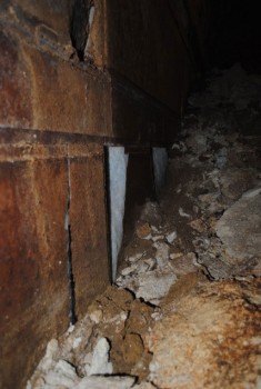 Στο νότιο τοίχο -στο εμφανές μέρος του- δεξιά και αριστερά του θυρώματος, συνεχίζεται η μαρμάρινη επικάλυψη. Οι υπερκείμενοι πωρόλιθοι καλύπτονται με επίχρισμα κόκκινου χρώματος. (φωτο 6). Έχει καταπέσει το εσωτερικό τμήμα του υπέρθυρου.(φωτο 7).