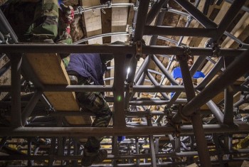 6. Λόγω της ευαίσθητης ισορροπίας στην οποία βρίσκεται η θόλος, οι τεχνικοί σύμβουλοι μαζί με το συνεργείο προσπαθούν, με λεπτές επεμβάσεις, να τοποθετήσουν την υποστύλωση χωρίς να διαταράξουν την ισορροπία που έχει δημιουργηθεί μετά τις εξωτερικές αποχωματώσεις.