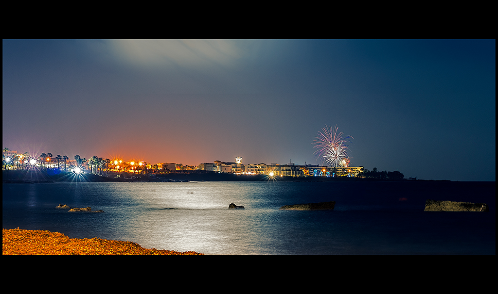 Ευχαριστώ για τις συμβουλές Κώστα. Απλώς προσπάθησα να δω αν σώζεται κάπως η κατάσταση επειδή πέτυχα εντελώς κατά λάθος τα πυροτεχνήματα. Στο κροπαρισμα που έκανα αφαίρεσα το κιτρινισμένο μέροςΣε τέλειες λήψεις, όπου γίνεται υπερέκθεση δίπλα σε πηγές φωτός, παρουσιάζεται ένα συνηθισμένο πρόβλημα. Το φωτισμένο από τον γλόμπο μέρος του τοπίου είναι έντονα κίτρινο και δεν μπορεί να δέσει όμορφα με το βαθύ μπλέ του ουρανού και της θάλασσας. Σε αυτές τις περιπτώσεις, διορθώνω πρώτα την ισορροπία του λευκού στο τμήμα που φωτίζεται από τον γλόμπο και μετά ασχολούμαι με την υπόλοιπη φωτογραφία.