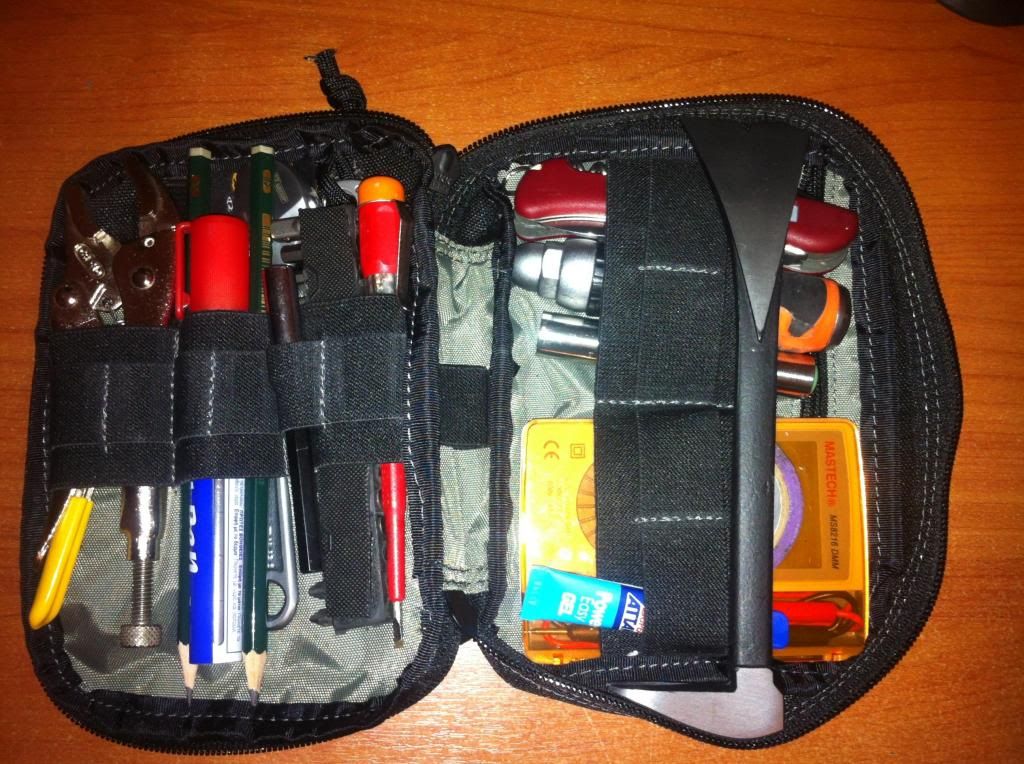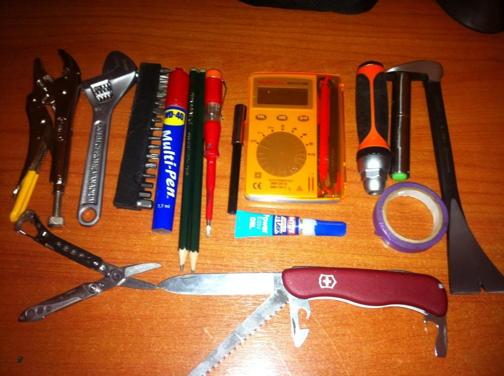 Μικρο , ποιοτικο, δοκιμαστικο κατσαβιδι..WD40 pen .. δυο μολυβια, ενα με σκληρη μυτη 5Η και ενα με μαλακη 6Β , φακος trustfire inox, Λοσταρακι stanley δυνατο (Υπεραπαραιτητο) το οποιο εχει βαρβατο προκοβγαλτη, και ανετα δουλευει σα σφυρακι ...ενα leatherman style cs κυριως για το ψαλιδακι του, και εναν βαρβατο victorinox (δε ξερω μοντελο) για το μαχαιρι, και το πριονι του! απο υλικα , μια στενη μονωτικη ταινια και μια παχυρευστη κολα στιγμης Bison..
