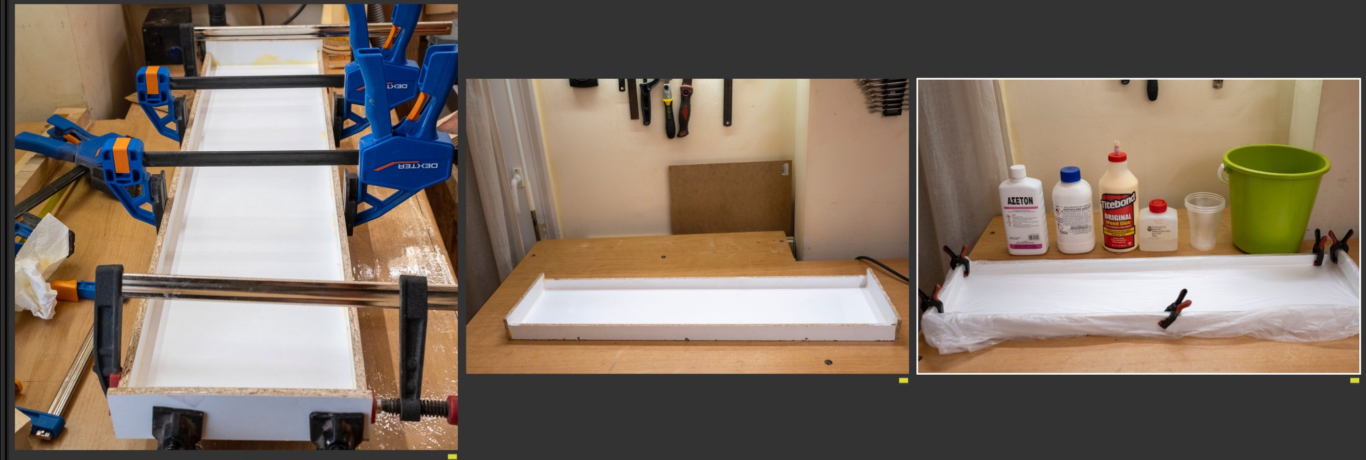 Εγώ έφτιαξα εύκολα μια 90x20cm από 8mm μελαμίνη. Τη στεγανοποίησα με ακριλική μαστίχη, αλλά επειδή βιαζόμουν και δεν περίμενα να στεγνώσει εντελώς η μαστίχη, την "έντυσα" και με ένα πλαστικό για να μην υπάρξει κάποια διαρροή.