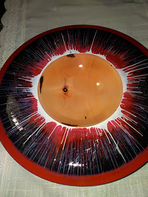 Νεροπλάτανος πάλι σε σχήμα πιατέλας, πέρασμα με μαυρη ανιλίνη όλη την πάνω επιφάνεια και μετα πειραματισμός με ακρυλικά χρώματα και φυγόκεντρο ώστε να διμηουργηθούνα τα σχήματα. Έπειτα άδειασμα στη μέση και πέρασμα διάφανου ακρυλικού σπρέι για γυάλισμα.